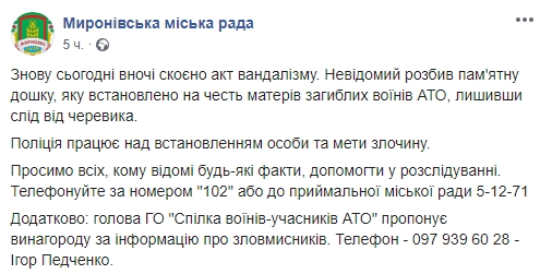 В городе Мироновка Киевской области в ночь на 2 июня неизвестный разбил памятную доску, которая установлена в честь матерей погибших воинов АТО, оставив след от ботинка.