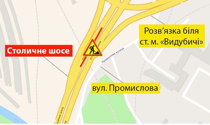 С 3 до 7 июня (ориентировочно) на Столичном шоссе специалисты «Киевтеплоэнерго» будут ремонтировать трубопровод (к работам приступают в ночь на 3 июня). Сроки могут измениться, так как после разрытия можно будет установить масштаб работ, во время которых ограничат движение на двух крайних левых полосах. Работать тепловики будут возле развязки и станции метро «Выдубичи» в направлении выезда из города.