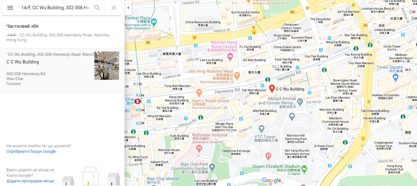 На сайте компании утверждают, что работает она легально и официально зарегистрирована в Гонконге. Офис, якобы, находится по адресу 14/F, CC Wu Building, 302-308 Hennessy Road, Wanchai, Hong Kong. Поиск в Google дает понять, что большое офисное здание по этому адресу действительно существует, но точного совпадения адреса нет, что странно: