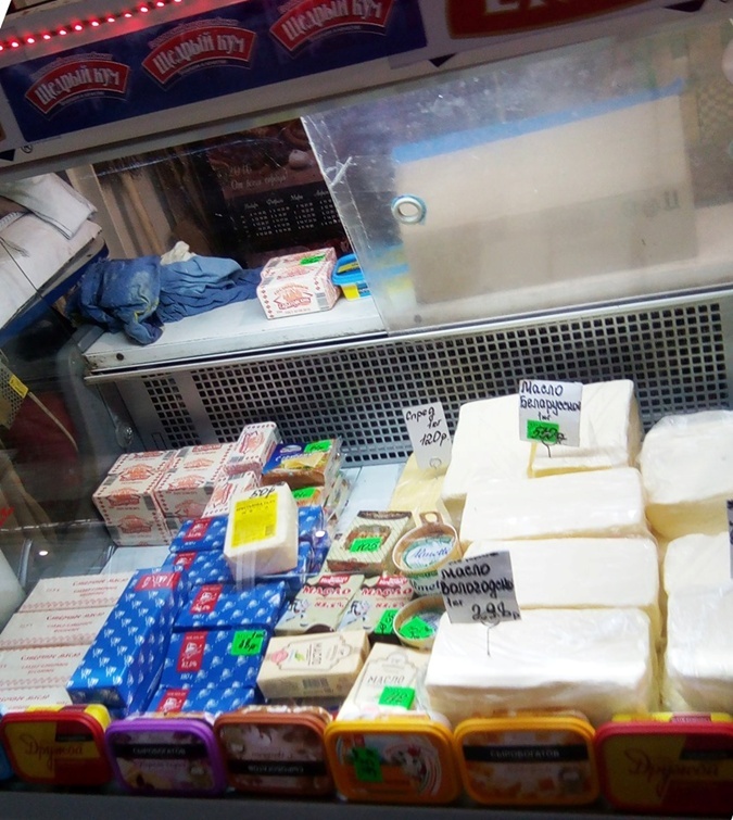 По словам корреспондента, также на прилавках присутствуют сыры в основном российского производства по средней цене 450 рублей (175 грн) за килограмм.