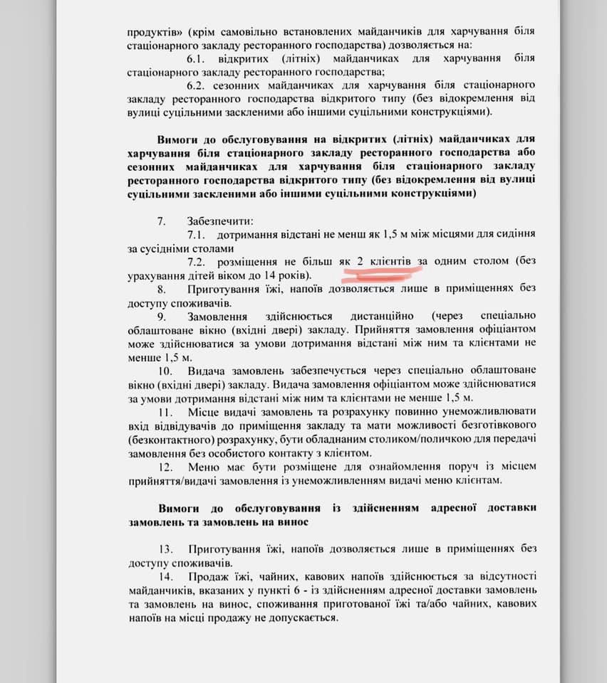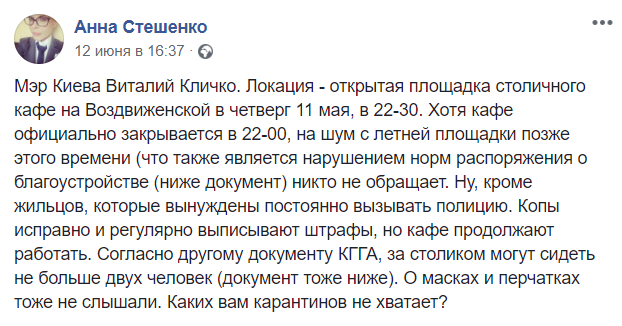 Как отметила Анна Стешенко, мэр и его спутники были без медицинских масок и перчаток. Кроме того, столичный мэр вместе со своими спутниками вчетвером находились за одним столиком. В то время как в КГГА ранее был принят ряд требований по работе учреждений общественного питания в Киеве, среди которых ограничение количества клиентов за одним столом. Согласно документу, киевским рестораном разрешено обслуживать не более двух клиентов за одним столом.