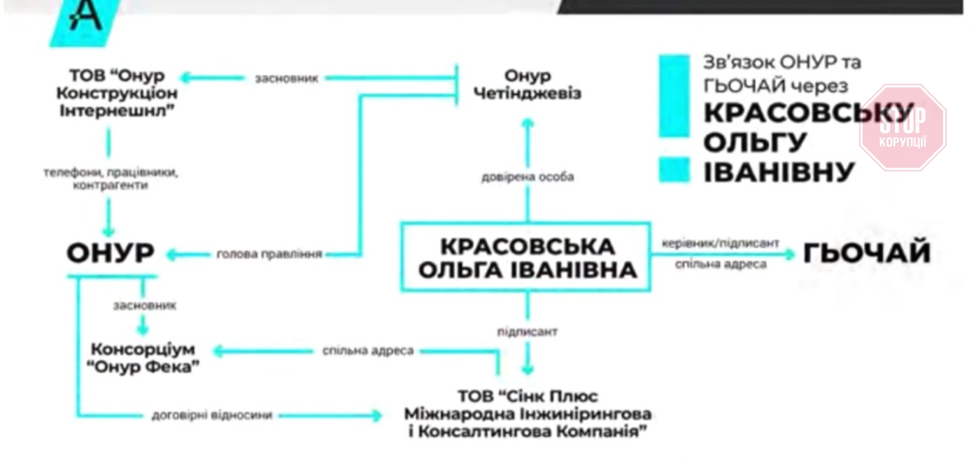 Як виявила громадська організація, дві допущені до аукціону фірми пов’язані. Керівник ТОВ «Гьочай» — Ольга Красовська, вона ж за довіреністю представляла інтереси засновника «Онур груп» Онура Четінджевіза. Проєктну документацію для тендера «Онуру» готувала фірма, підписантом якої є та ж пані Красовська.
