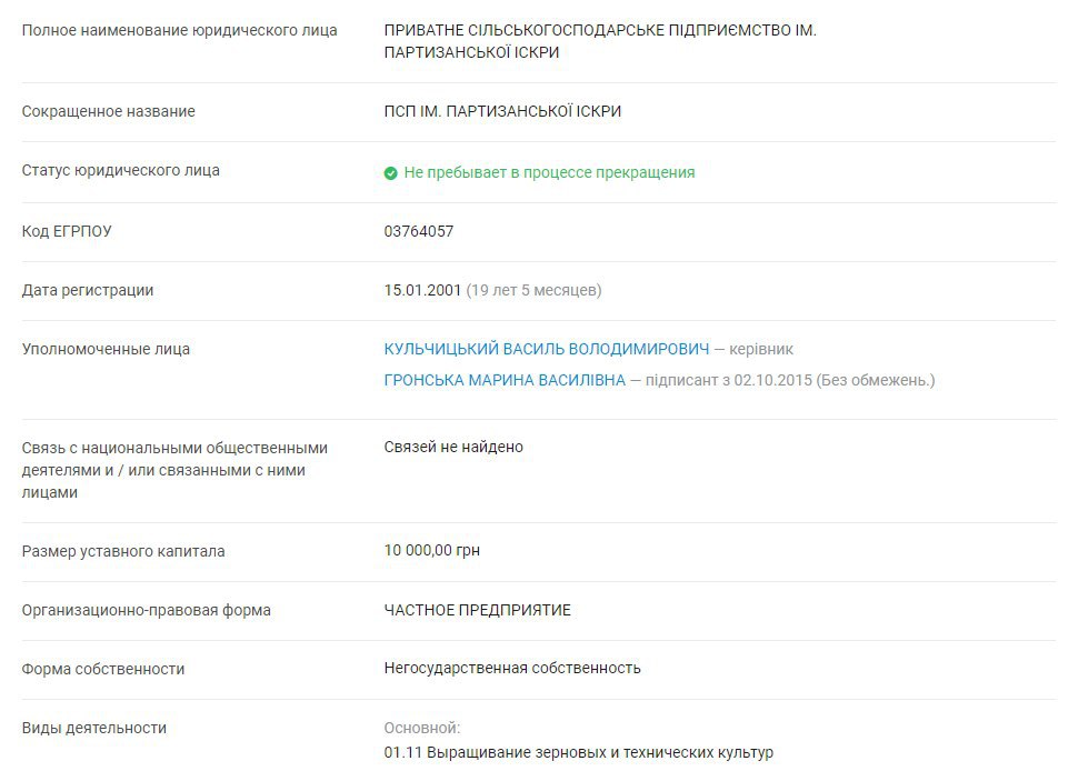 Интересно также, что соседи доходов Марины Гронской значатся 345 тыс. гривен дохода от предпринимательской деятельности, а также «подарок» в 2,8 млн гривен от некоего Василия Кульчицкого. Интересно, что в декларации Гронского никаких бизнес-активов его жены не указано, но, согласно данным аналитической системы YouControl, тот самый Василий Владимирович Кульчицкий — глава и формальный владелец сельскохозяйственной фирмы «ЧСП «Имени Партизанской Искры», которую по факту контролирует и имеет там право подписи Марина Гронская.