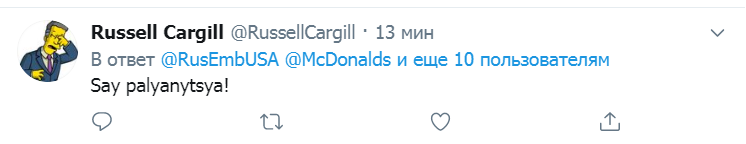"История с McDonald’s так зацепила посольство России в США, что они запостили это к себе в Twitter с подписью: "Следующий шаг – скажи паляниця?! Слово паляниця во время Второй мировой использовали украинские националисты, чтобы определять русских". МакПаляниця. Звучит неплохо", – отметил пользователь Остап Ярыш.
