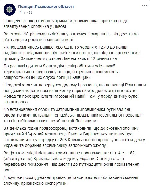 В четверг, 18 июня, полиция Львова оперативно задержала парня, который несколькими часами ранее якобы изнасиловал в парке 12-летнего мальчика.