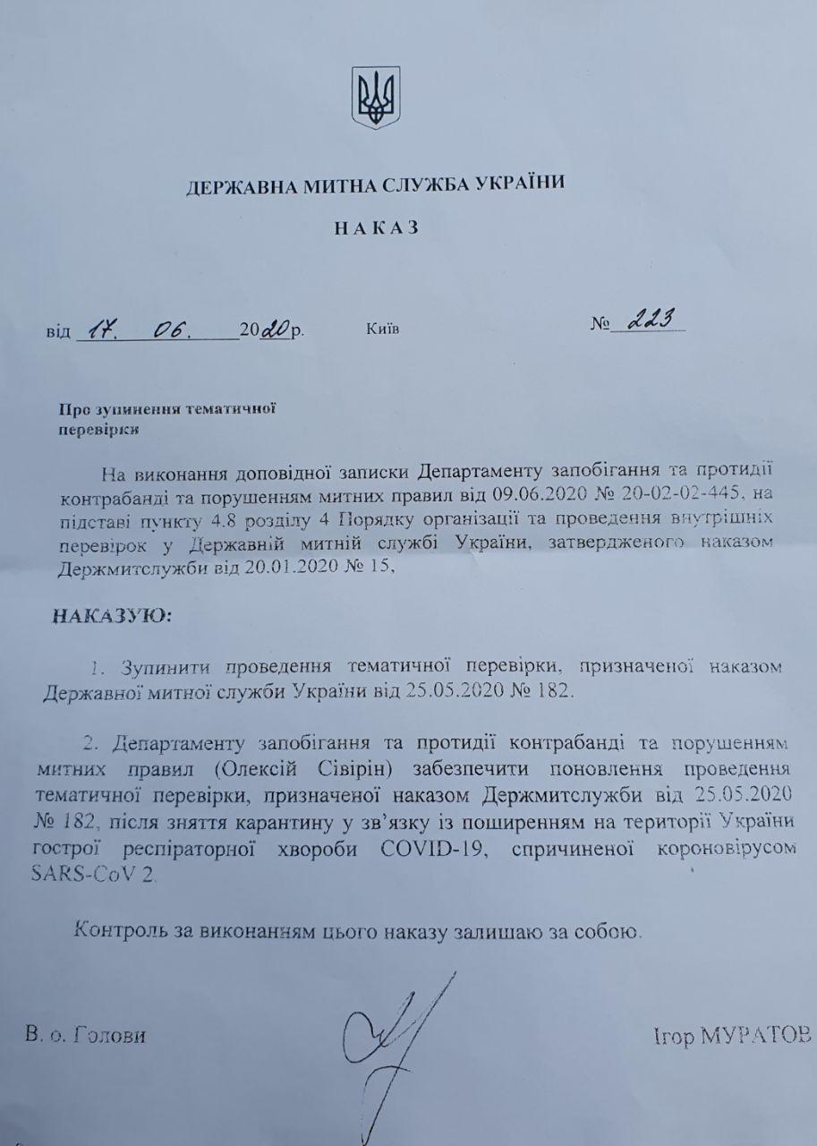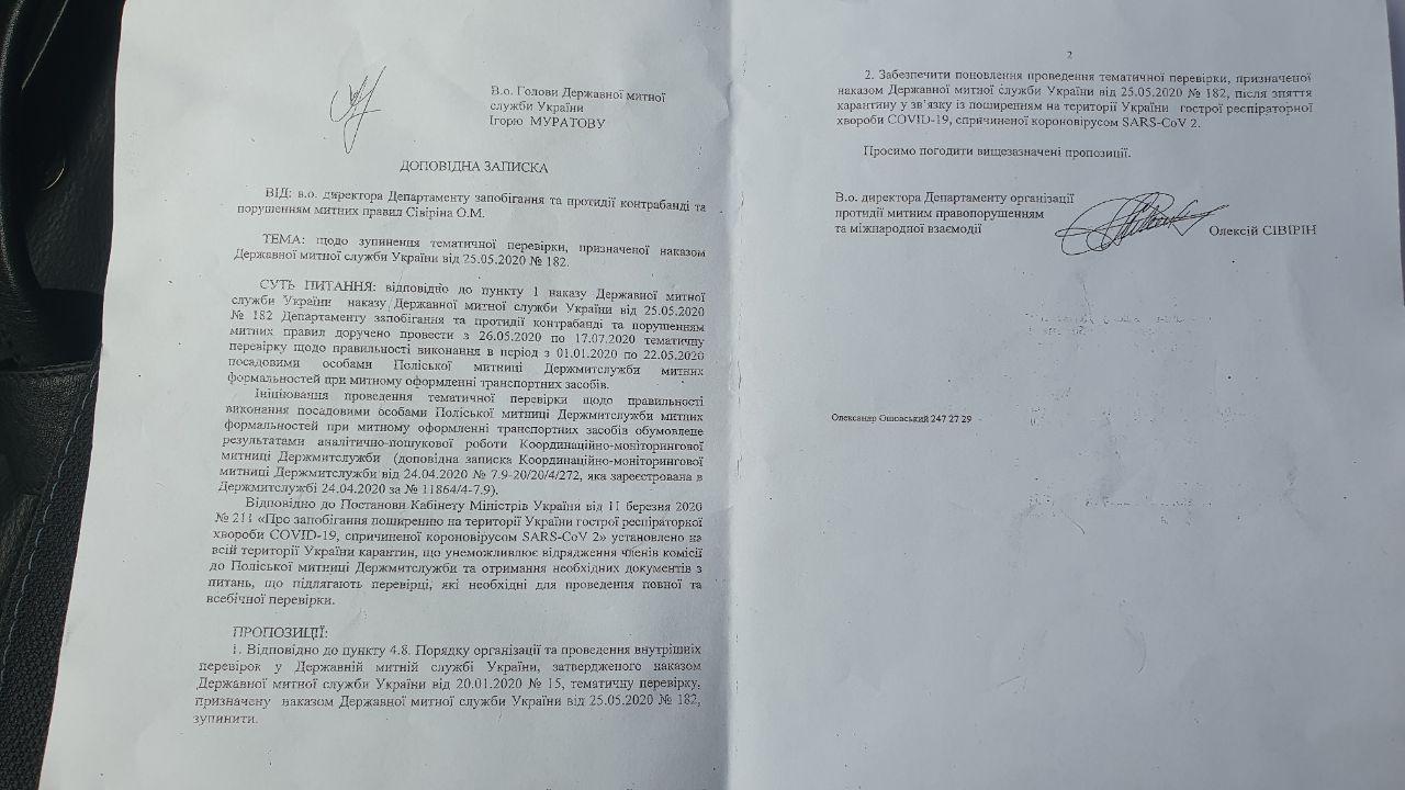 Позавчера, 17.06 Игорь Муратов с подачи Алексея Сивирина остановил тематическую проверку "Поліської митниці" которая проводилась на предмет выявления схем минимизации платежей при растаможке авто.