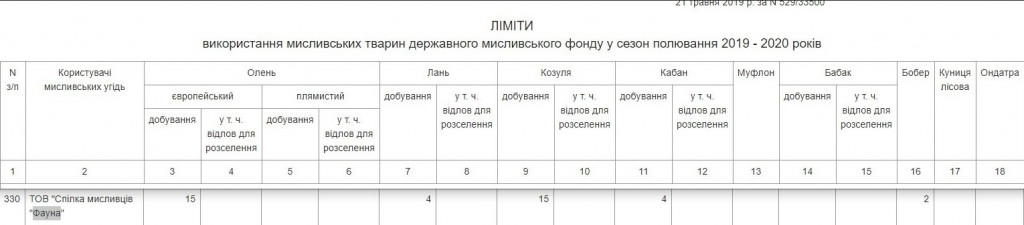 Зазначимо, що, згідно наказу Мінагрополітики від 21 травня 2019 року № 529/33500, для ТОВ “Спілка мисливців “Фауна” були затверджені наступні ліміти використання мисливських тварин державного мисливського фонду у сезон полювання 2019 – 2020 років: 15 європейських оленів, 4 лані, 15 козуль, 4 кабани, 2 бобри.