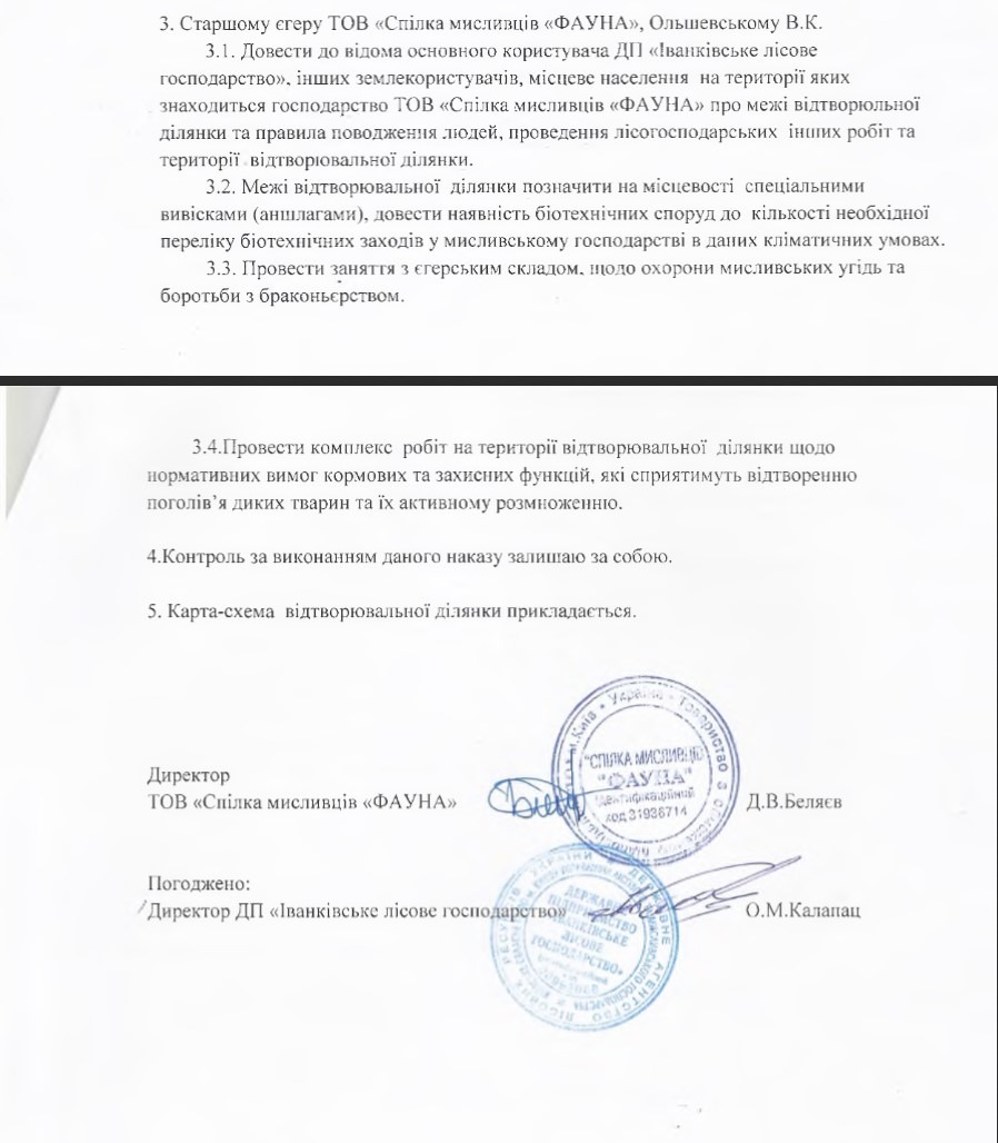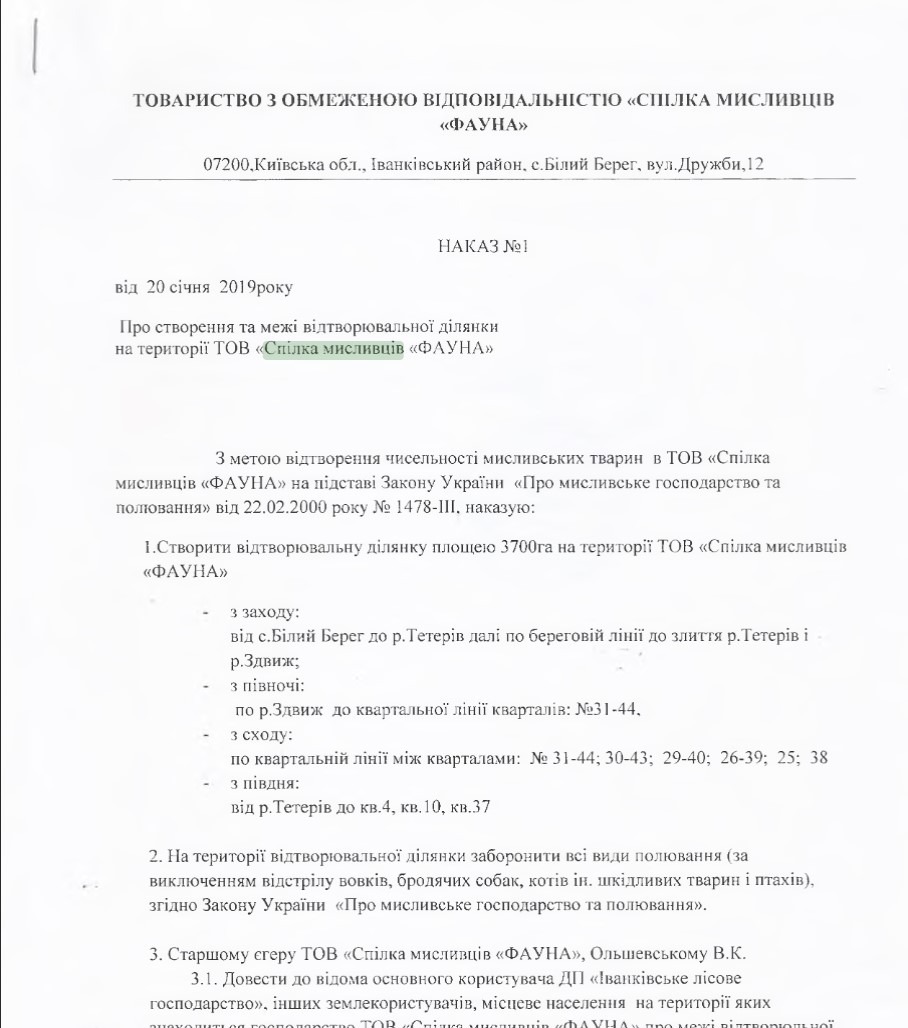 Як стало відомо KV, 21 грудня 2017 року Іванківська районна рада ухвалила рішення № VІІ-30/372 згідно із яким “Фауні” надавалося 11 043 га угідь у користування строком на 49 років. Для отримання землі мисливське господарство зобов’язали відшкодовувати збитки за пошкоджені сільськогосподарські посіви, які були заподіяні мисливськими тваринами сільгоспвиробникам та селянським господарствам. Крім цього, ТОВ поставили умови по наданню можливості безкоштовного колективного полювання місцевим мисливцям на території відповідних угідь, а також попросили не перешкоджати вільному доступу місцевого населення в ліс у будь-яку пору року на всій території мисливських угідь.