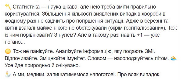 «Опять накручивается паника и раздаются угрозы в адрес населения — мол, во всем виноваты нарушители санитарного режима, которые не носят масок, подходят близко друг к другу, плохо моют руки… Друзья с настороженностью переспрашивают: действительно ли это так? Что там в больнице? Правда ли, что стало хуже? Смотрю я на все это с удивлением и понимаю, как на глазах происходит умелая манипуляция и искажение фактов. Как из обычных вещей создается проблема. И все последствия потом ложатся на плечи граждан, — написал, в частности, врач в Facebook.