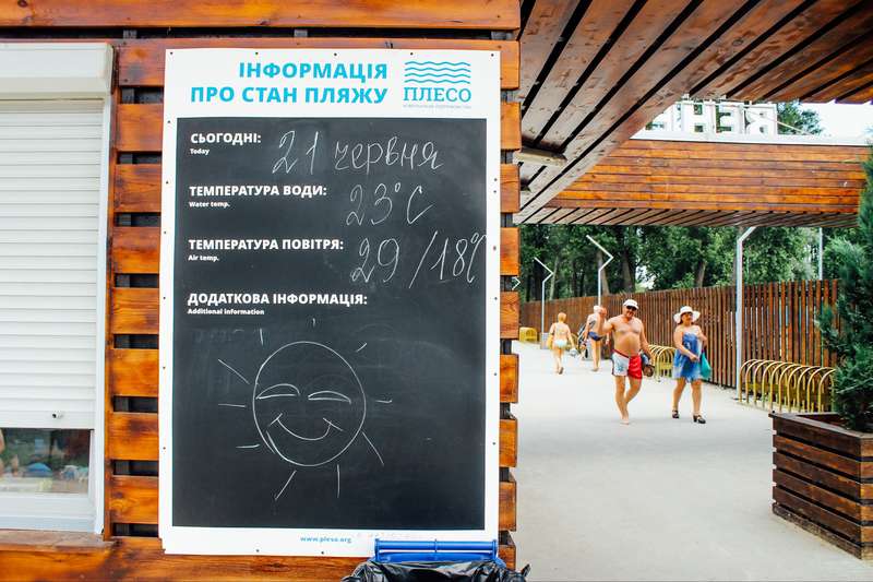 Запрет купаться киевляне, конечно, тоже обошли. Администрация пляжа вместо того, чтобы предупреждать о том, что купание пока не разрешено, пишет на дощечке температуру воды и разместила по пляжу спасателей.