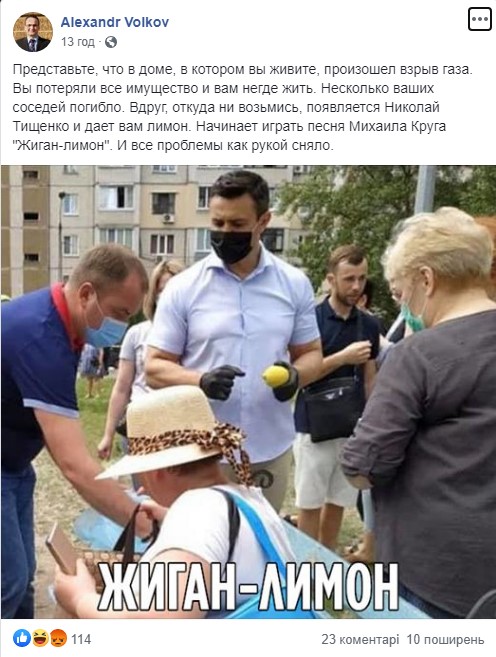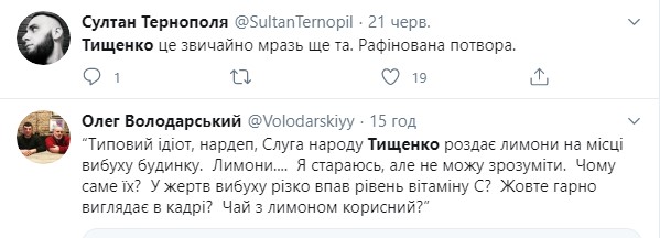 "Чого все знущаються над Тищенком, який приїхав на Позняки з лимонами? Людині подзвонили, сказали, що потрібно допомогти постраждалим з розселенням і покупкою речей найпершої потреби. І для початку вистачить пари лимонів. Він і привіз! Я боюся, якщо хтось попросить його "дамські пальчики" привезти або "чорного доктора ...", – написав журналіст Кирило Сазонов.