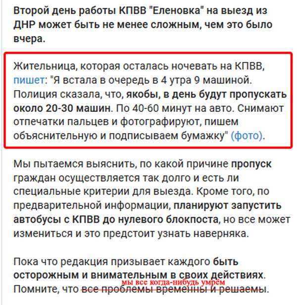Однако представители оккупационных администраций не спешили с пропуском. Они устроили на своей «таможне» снятие отпечатков пальцев у всех выезжающих. Также брали расписку о невозможности возвращении в «республику» вне гуманитарных коридоров.