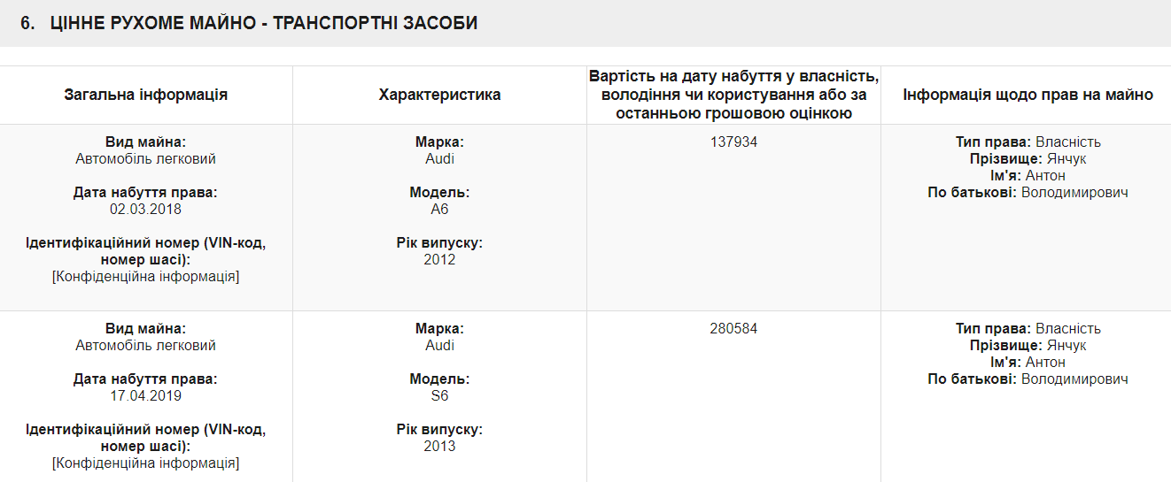 У декларації перед звільненням, поданій наприкінці січня цього року з цінного рухомого майна Янчука зазначено два автомобілі. Це Audi А6 2012 року випуску за 137 934 грн. та Audi S6 2013 року випуску за 280 584 грн. Принайнмі, такі ціни на авто зазначено у документі. Тож як екс-чиновник міг отримати за реалізацію одного з них понад півмільйона гривень?