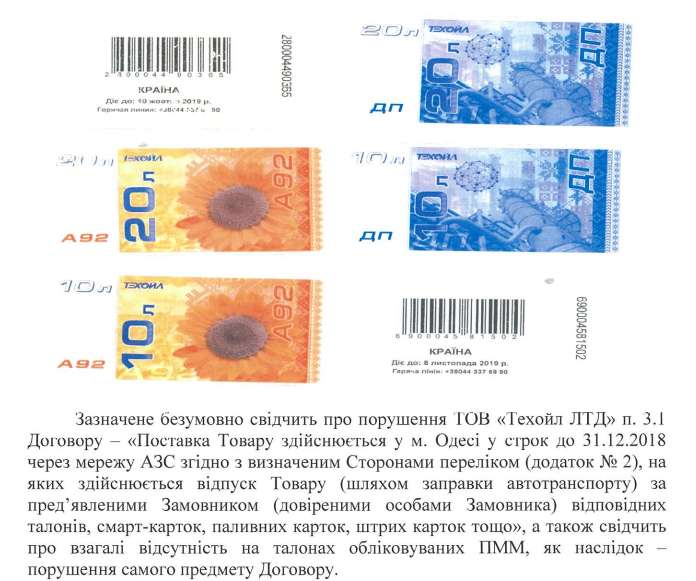 Согласно договору с КП «Городские дороги», ООО «Техойл ЛТД» обязалось поставлять топливо по талонам — там заявили, что заключили перекрестные договоры о сотрудничестве с ООО «Торговый дом «Сан Ойл» (сеть заправок Sun Oil — Ред.) и ООО «Мотто-Евро» (сеть заправок Motto Oil — Ред.). Коммунальщики заплатили фирме Пащенко 3,8 млн гривен, получив за это талоны на 80,3 тыс. литров ДТ и 55,1 тыс. литров бензина «А-92».