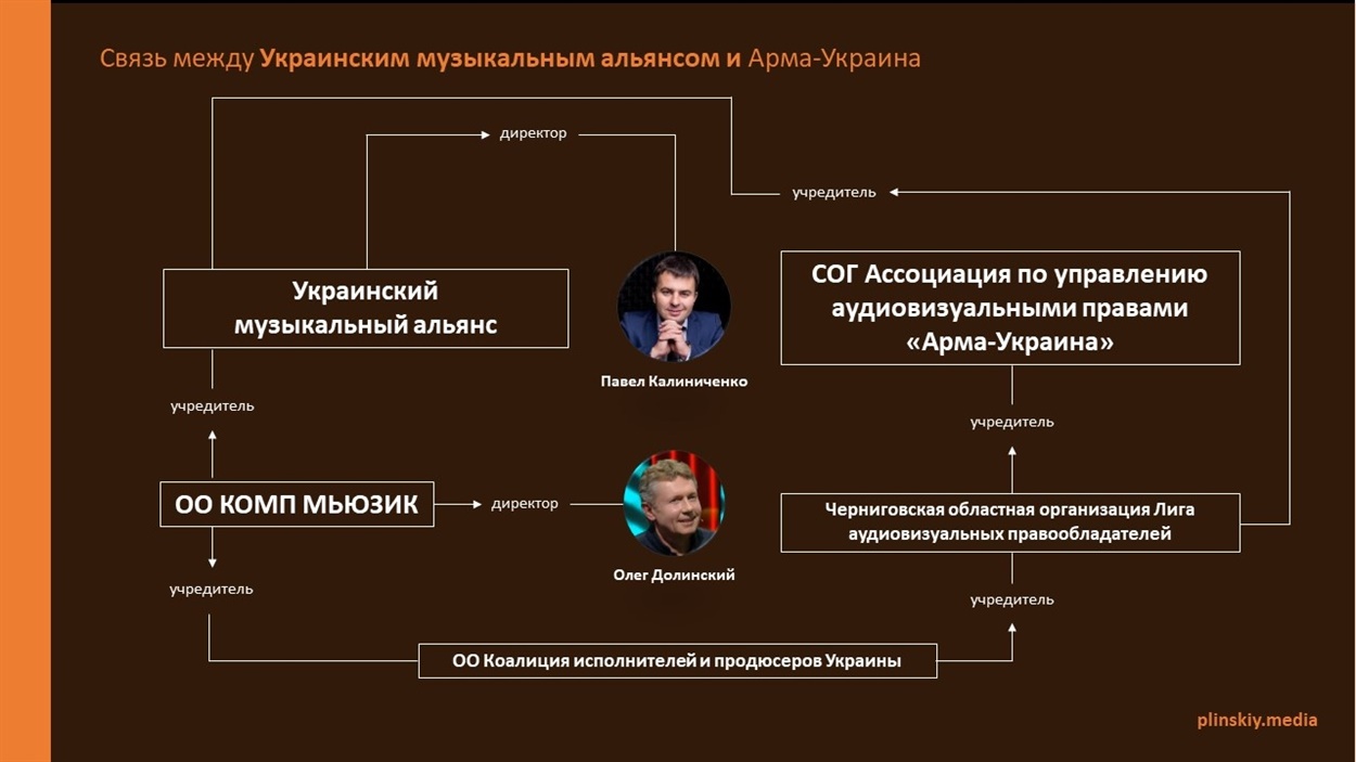 ОО Коалиция исполнителей и продюсеров Украины. В списке учредителей Ирина Билык, Руслана Лыжичко, Игорь Лихута и Константин Меладзе. Руководитель – Дмитрий Прикордонный. Уже известен нам фактом получения денег с подконтрольных Калениченко и Долинскому средств