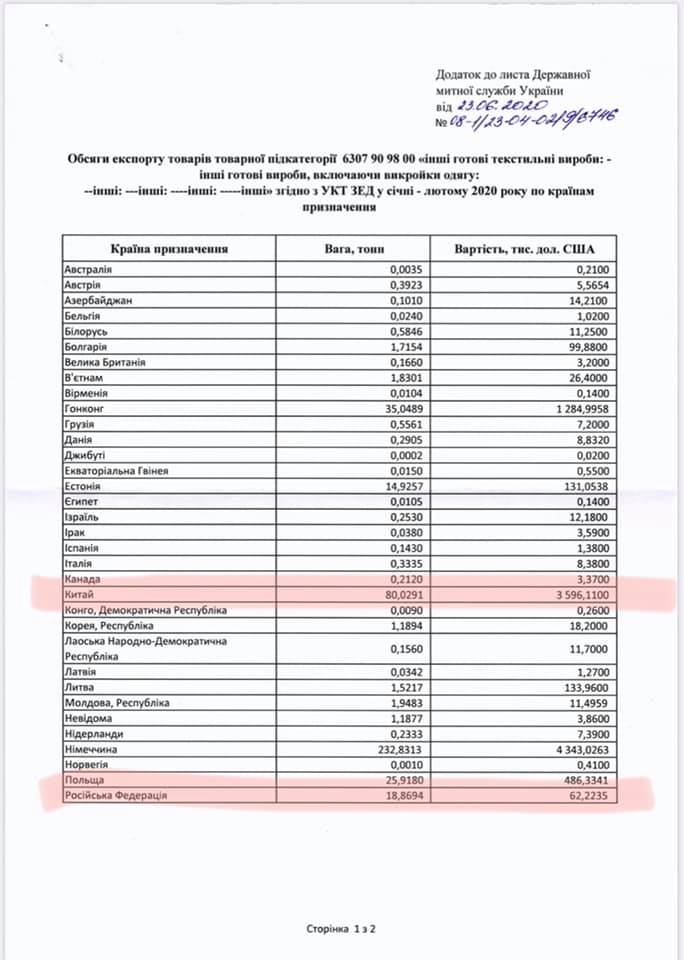 Кроме того, 18 тонн масок Украина экспортировала в Россию по цене 3,3 тыс. долл. за одну тонну. В то же время Китаю маски продавали по 45 тыс. долл. за тонну, а Польше - по 18,7 тыс. долл.