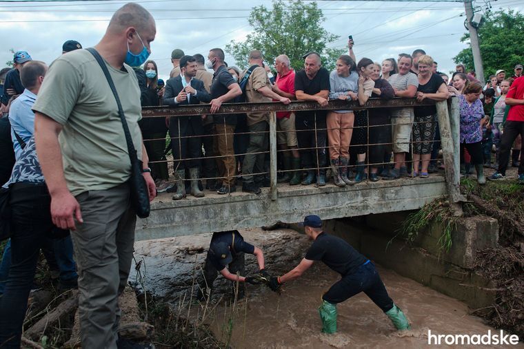 "Сельчане поднимаются с ними. Пытаются докричаться до президента, просят сделать селфи. На мостике сельский голова почти 15 минут отчитывается перед Зеленским и Аваковым – объясняет, почему затопило. Зеленский перебрасывается несколькими словами с местными, смотрит с Аваковым на течение. Разворачиваются и таким же плотным кольцом охраны идут обратно к кортежу", – комментируют события журналисты.