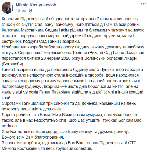 Со своей стороны председатель Пидлозцивской объединенной территориальной общины Ривненской области, где проживала умершая, Николай Костюкевич в Facebook отметил, что врачи почти шесть дней боролись за жизнь женщины, а кроме новорожденной девочки без матери осталось еще 4 детей.