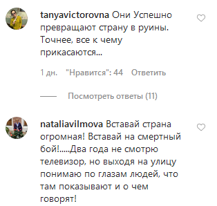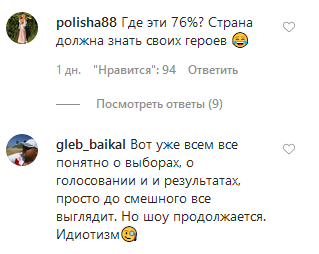 Подписчики Садальского были с ним солидарны. «В последнее время мы живём в каком-то сюрреализме! И чем дальше, тем больше…», «Где эти 76%? Страна должна знать своих героев», «Они Успешно превращают страну в руины. Точнее, все к чему прикасаются», «Вставай страна огромная! Вставай на смертный бой!…..Два года не смотрю телевизор, но выходя на улицу понимаю по глазам людей, что там показывают и о чем говорят!», «Вот уже всем все понятно о выборах, о голосовании и результатах, просто до смешного все выглядит. Но шоу продолжается. Идиотизм», — констатировали пользователи Сети.