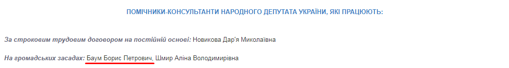 На сайте ВР сказано, что Баум является одним из помощников нардепа "на общественных началах".