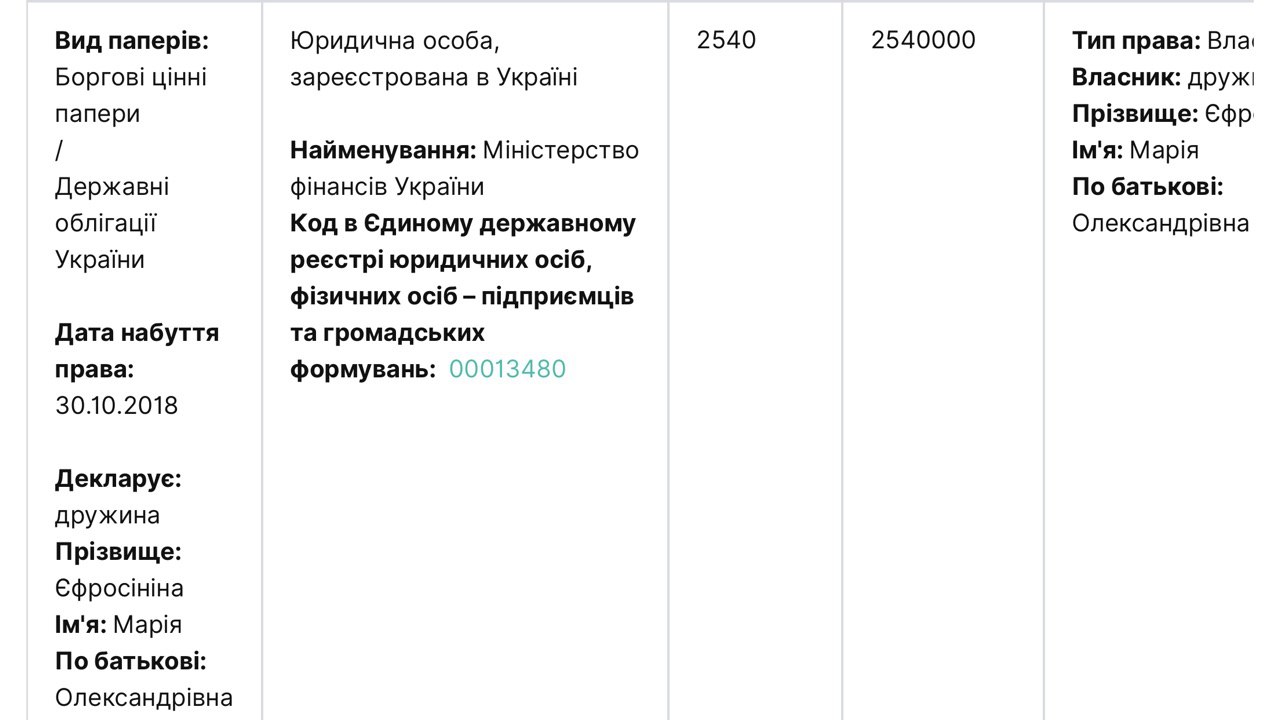 Как стало известно в ходе изучения электронной декларации ее мужа, главы Национальной комисси фондового ринка и ценных бумаг( НКФРЦБ ) Тимура Хромаева, за 2018 и 2019 гг., Мария Ефросинина вполне успешно освоила азы финансовой политики и за 2 года заработала на купле/продаже облигаций внутреннего гос займа(ОВГЗ) почти миллион долларов США. И почти 100 тыс долларов на выплате процентов по ним.