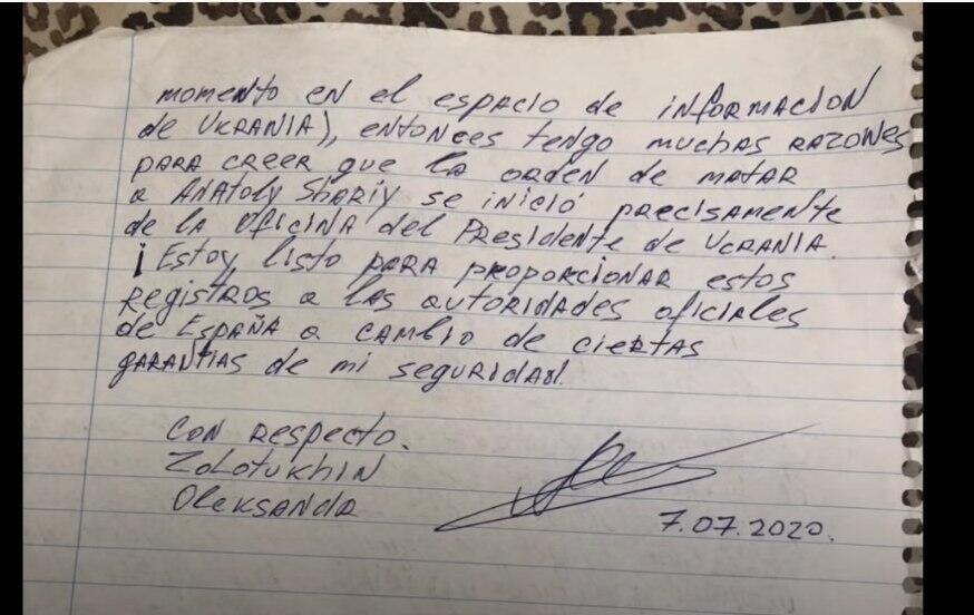 "Вот это заявление было написано несколько часов назад в испанскую полицию. В данном заявлении некто Александр Золотухин указывает на то, что он получил заказ на политическое убийство блогера Анатолия Шария. Заказ им получен, как он указывает, людьми, которые имеют непосредственное отношение к Офису президента Украины Зеленского", – говорится на видео.