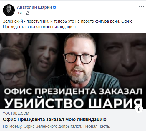 При этом он назвал главу государства Владимир Зеленского преступником, а к организации его "ликвидации" якобы причастен заместитель главы ОПУ Кирилл Тимошенко и его помощник Сергей Малыхин. Видеообращение Шарий опубликовал в Facebook.