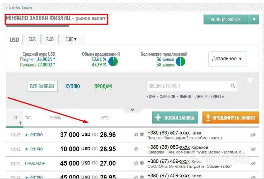 Предложения о покупке и продаже валюты на специализированном сайте Скриншот
