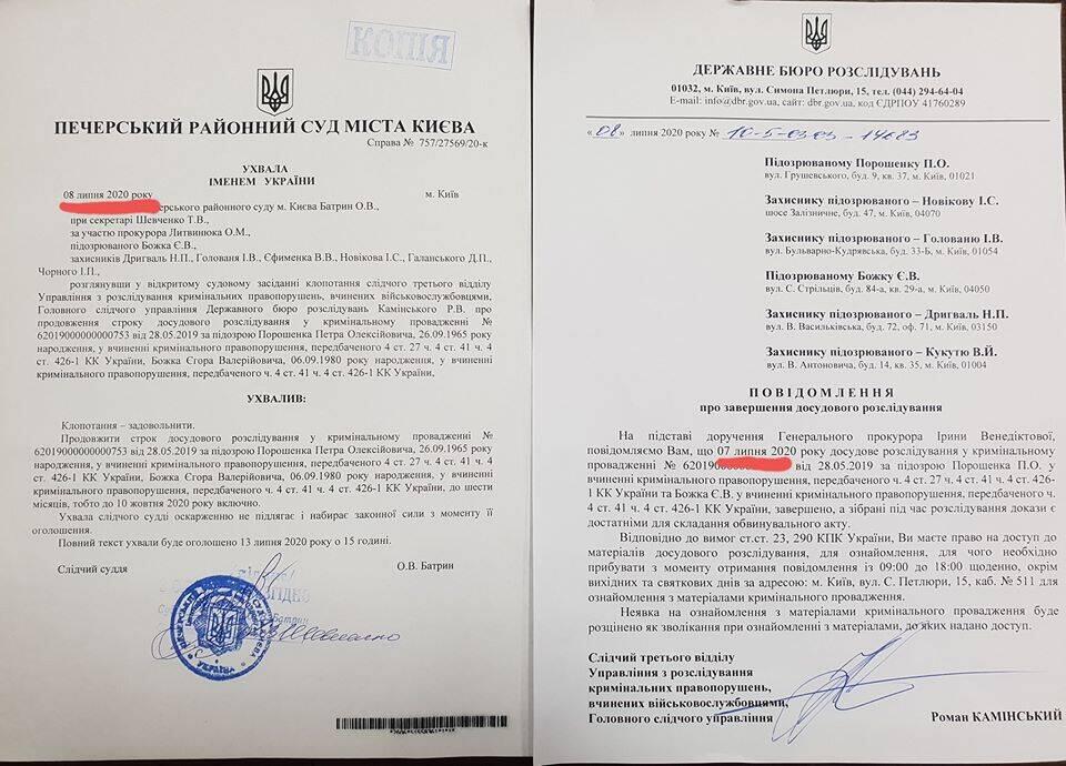 Однако, уже во время судебного заседания представитель Государственного бюро расследований сообщил, что у него есть постановление генпрокурора Ирины Венедиктовой о завершении досудебного следствия – оно было принято еще 7 июля. Кроме того, Новиков написал, что ходатайство об избрании Порошенко меры пресечения не подлежит рассмотрению.