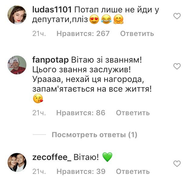 Под постом коллеги артиста и его друзья из сферы шоу-бизнеса поздравили Потапа с получением заветного звания. Среди них – ведущий Юрий Горбунов, певцы Александр Пономарев и Дзидзьо, певица Надя Дорофеева, дуэт Тамерлан и Алена Омаргалиева, российский шоумен Александр Ревва (Артур Пирожков), экс-супруга продюсера Ирина Горовая и прочие.