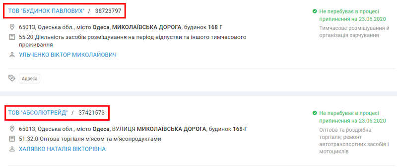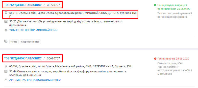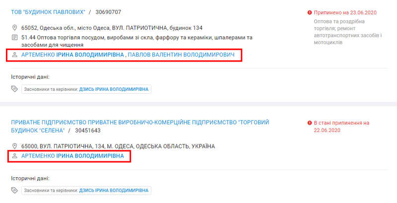 За декларацією родинних зв’язків, тесть Артеменка Валентин Павлов індивідуальний адвокат з 2013 року, але на порталі «Судова влада», ми не знайшли справ, де Павлов виступав захисником. Свою діяльність проводить за адресою Миколаївська дорога, 168. Там, на узбережжі, розміщений уже згадуваний готельний комплекс «Дім Павлових», що складається з великих житлових і нежитлових приміщень. Земельними ділянками під ними володіє теща Ганна Павлівна. Обоє заснували вже згадане ТОВ «Дім Павлових», де працювала їхня дочка Ірина Артеменко і яке нині припинене. У ЄДР ми також відшукали чинне товариство з пропискою на території готелю, але з мінусовим чистим прибутком.