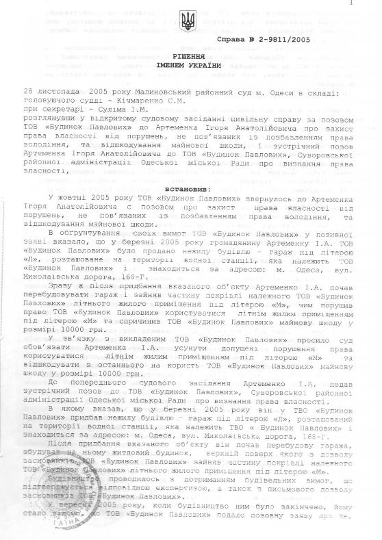 І це дуже цікавий об’єкт. Право власності на нього виникло на підставі рішення Малиновського суду м. Одеси від 28.11.2005 року в справі № 2-9811/2005. Важливо зазначити, що нерухомість розташована в Суворівському районі і відповідно до ст. 114 чинного на той момент ЦПК позов мав би розглядатись Суворівським судом міста Одеси.