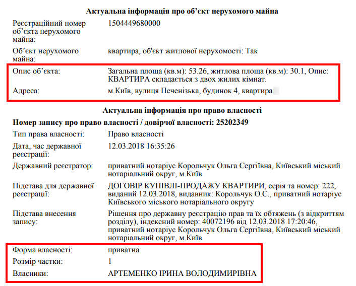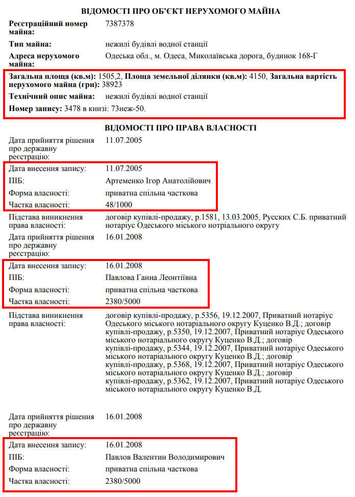 З нього випливає, що І. Артеменко на підставі договору купівлі-продажу від 13.03.2005 року придбав у ТОВ «Будинок Павлових» 48/100 частин нежилих будівель водної станції. Підписантом цього договору та директором ТОВ «Будинок Павлових» була дружина члена ВРП – Артеменко Ірина Володимирівна.