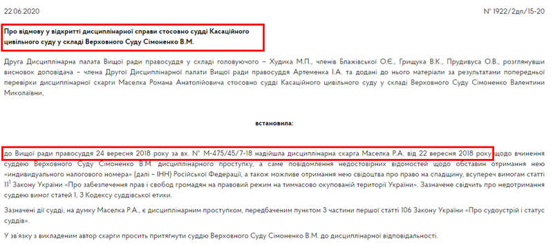 Схожа історія відбулася і з суддею Верховного Суду Валентиною Сімоненко, скарга на яку близько двох років припадала пилом. У 2018 році виявилось, що в неї є податковий номер Російської Федерації. Коли виник скандал Сімоненко сказала, що це просто окупанти використали старі бази даних і автоматично присвоїли їй цей номер. Але це не могло бути правдою, бо цей номер видано на паспорт Сімоненко, який вона отримала у 2015 році. Тобто хтось мав надати агресорам її нові дані. Ця очевидна брехня і стала підставою для скарги. Але з розглядом зволікали. Лише після того як скаржник звернувся до суду на очевидне затягування, Артеменко виніс скаргу на розгляд і просив у відкритті провадження відмовити. Палата підтримала його та вирішила, що в діях Сімоненко немає жодних порушень.