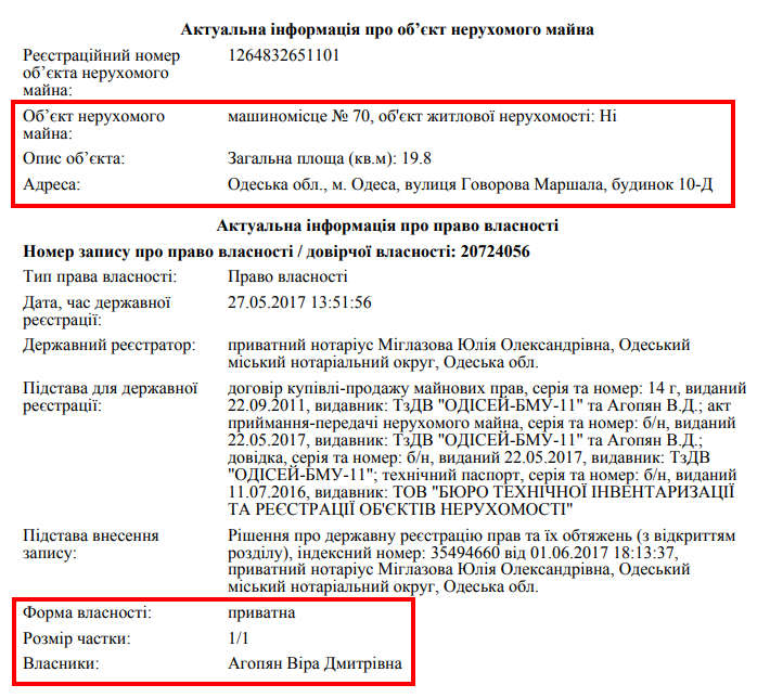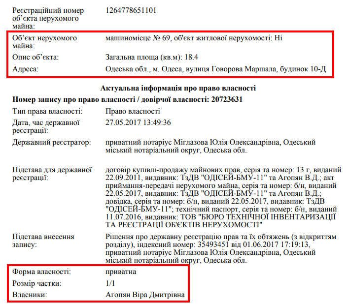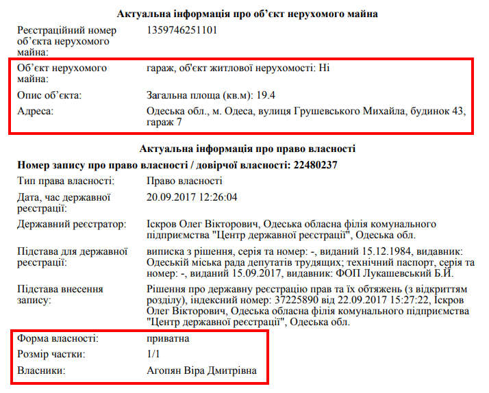 Це – весь перелік задекларованого родинного майна. Нам також вдалося дізнатися імена батьків члена ВРП. А ще – перевірити, яку ж нерухомість вони змогли нажити. Мати Віра Агопян не була зареєстрована підприємицею, і часток у бізнесі ми також у неї не знайшли. Раніше отримувала дохід від приватного підприємства «Пром-Торг», коли керівником і головним бухгалтером була Ганна Павлова. Однак у власності Віри Дмитрівни ми знайшли квартиру в Одесі площею 66,8 кв. м і три гаражі. За нашою інформацією, окремі договори на купівлю цих гаражів підписував від імені матері саме член ВРП Ігор Артеменко.