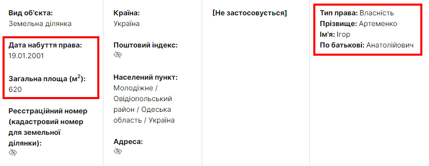 За даними декларації, яку Ігор Артеменко заповнив за підсумками 2019 року, у розпорядженні його родини лише одна земельна ділянка площею 0,062 га на Одещині.