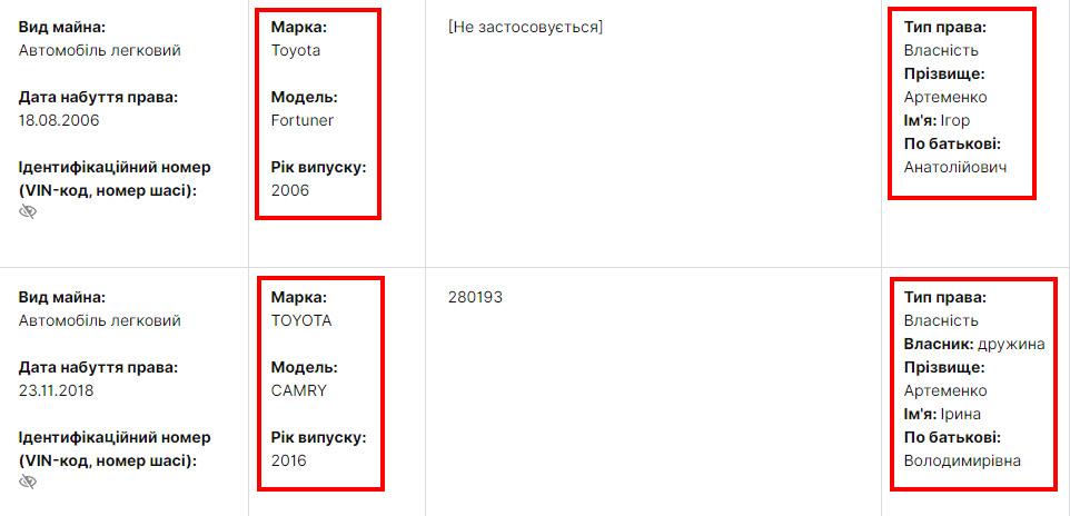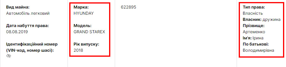 Якщо вірити торішній декларації Ігоря Артеменка, у власності його родини три легкові автомобілі: Toyota Fortuner, Toyota Camry 2016 року випуску за 280 тис. грн та Hyundai Grand STAREX за 622 тис. грн.