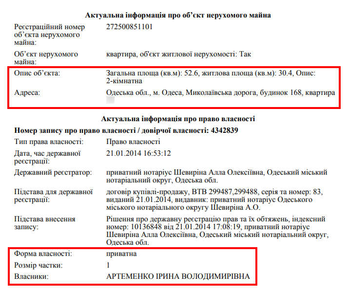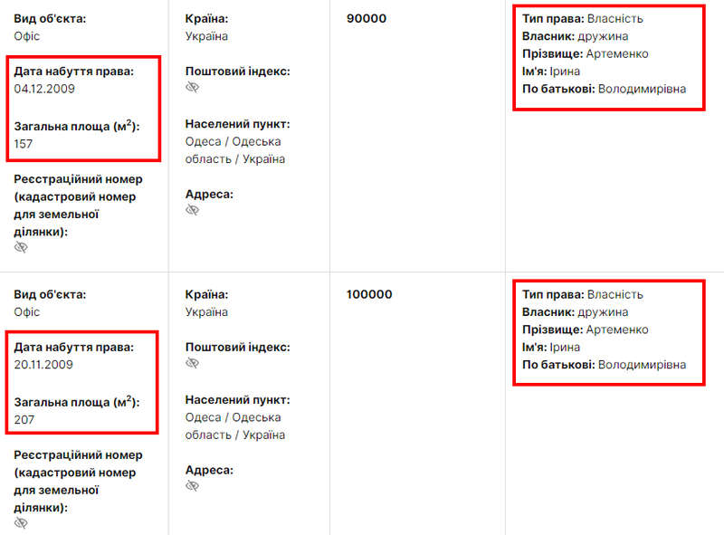 Дружиною Іриною Артеменко задекларовано дві квартири: перша площею 52,6 кв. м розміщена майже на узбережжі Одеси та придбана за допорогові 149 тис. грн. Друга – київська – на 53,2 кв. м вартістю 798 тис. грн. До речі, мало не забули. Додатково в розпорядженні дружини члена ВРП з 2009 року два нежитлові приміщення в Одесі, придбані майже за 24 тисячі доларів США. На стадії будівництва ще одне велике офісне приміщення разом із паркомісцями.