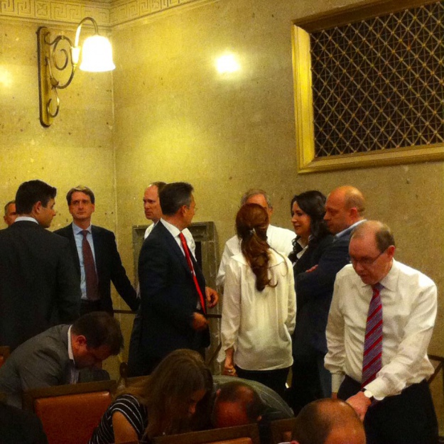 Зала на сто місць була заповнена вщент. Підтримати Фірташа, окрім депутатів, приїхали і його топ-менеджери. У першому ряду розмістився глава Group DF Борис Краснянський та головний медіа-менеджер Фірташа Ганна Безлюдна – босс міг завжди перебувати з ними у візуальному контакті.