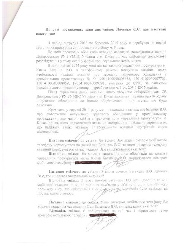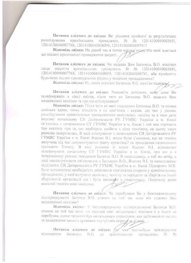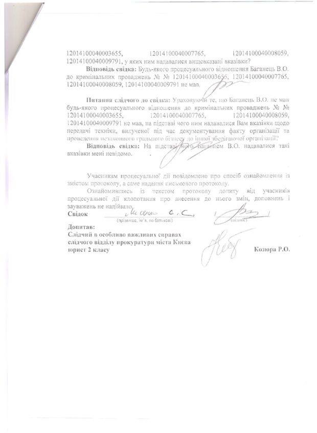 Некоторые протоколы, как и список документов с фамилиями свидетелей (прокуроров, милиционеров) показывают: рядовые правоохранители возмутились давлением на них со стороны руководства прокуратуры Киева, а точнее – со стороны Баганца-младшего. Правоохранители взбунтовались, потребовав прекратить заставлять их выполнять преступные указания.