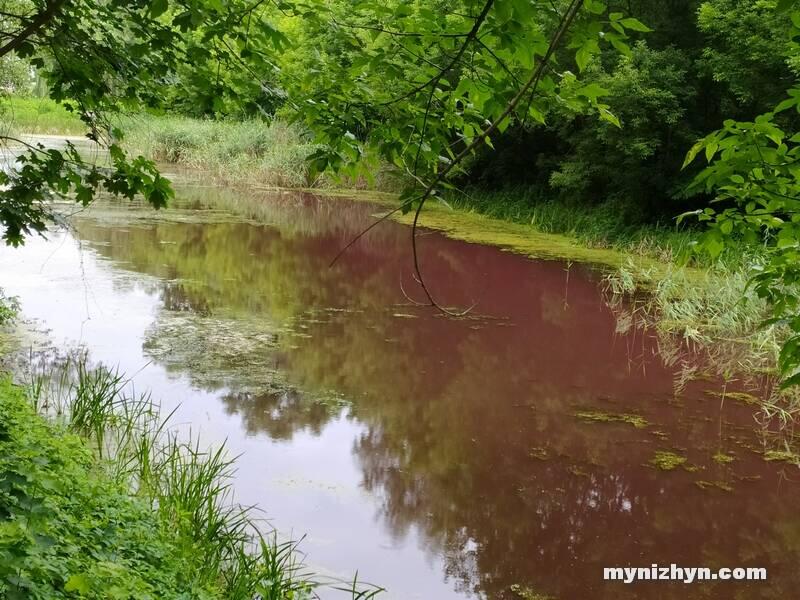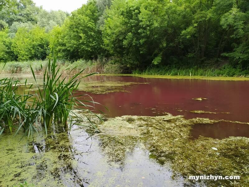 В Нежине Черниговской области водоем в Графском парке окрасился в розовый цвет. Необъяснимое явление сопровождается неприятным запахом и мором рыбы.