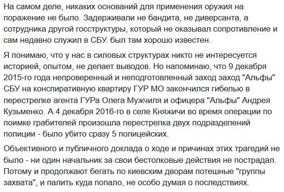 «Поражает уровень непрофессионализма сотрудников СБУ. Они устроили стрельбу в густонаселенном районе. А вы слышали про рикошеты? Вы понимаете, что можете убить того, кого хотите задержать? Понимаете, что могли попасть в других людей? Понимаете, к каким последствиям это могло привести? Вижу, что не понимаете», — пишет он.