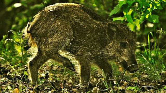 На одном снимке запечатлен поросенок. Он был настолько занят поиском вкусной пищи, что не заметил приближения ученого. Сотруднику удалось сделать фото с расстояния ближе 10 метров. Молодое животное смешно отмахивалась задней конечностью от комаров. Рядом под дубом были замечены еще шестеро поросят в хорошей физической форме.