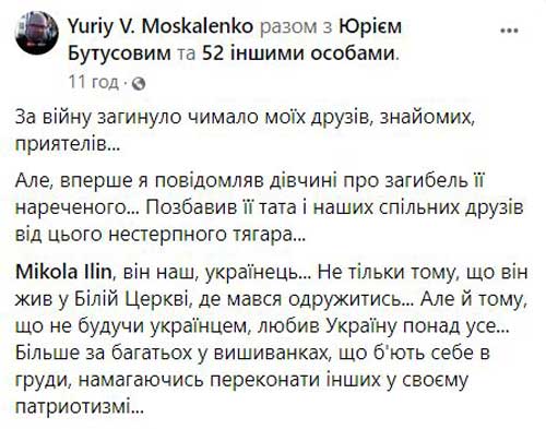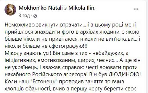 «Mikola Ilin, он наш, украинец … Не только потому, что он жил в Белой Церкви, где должен был жениться … Но и потому, что не будучи украинцем, любил Украину превыше всего … Больше, чем многие в вышиванках, которые бьют себя в грудь, пытаясь убедить других в своем патриотизма … И погиб, защищая Украину от оккупантов, оказывая медицинскую помощь и спасая своего раненого собрата «, — пишут побратимы украинского медика.