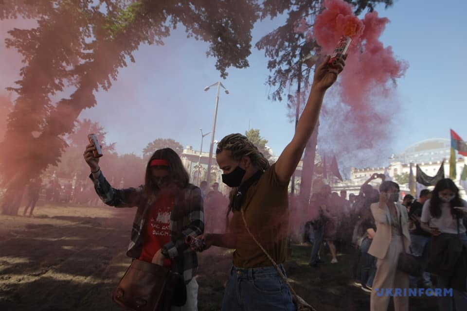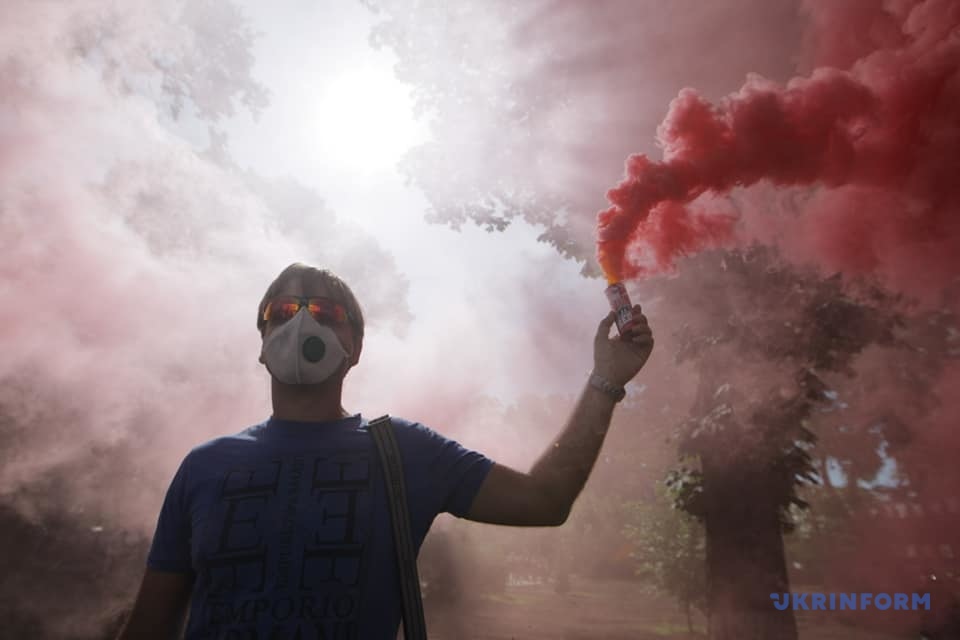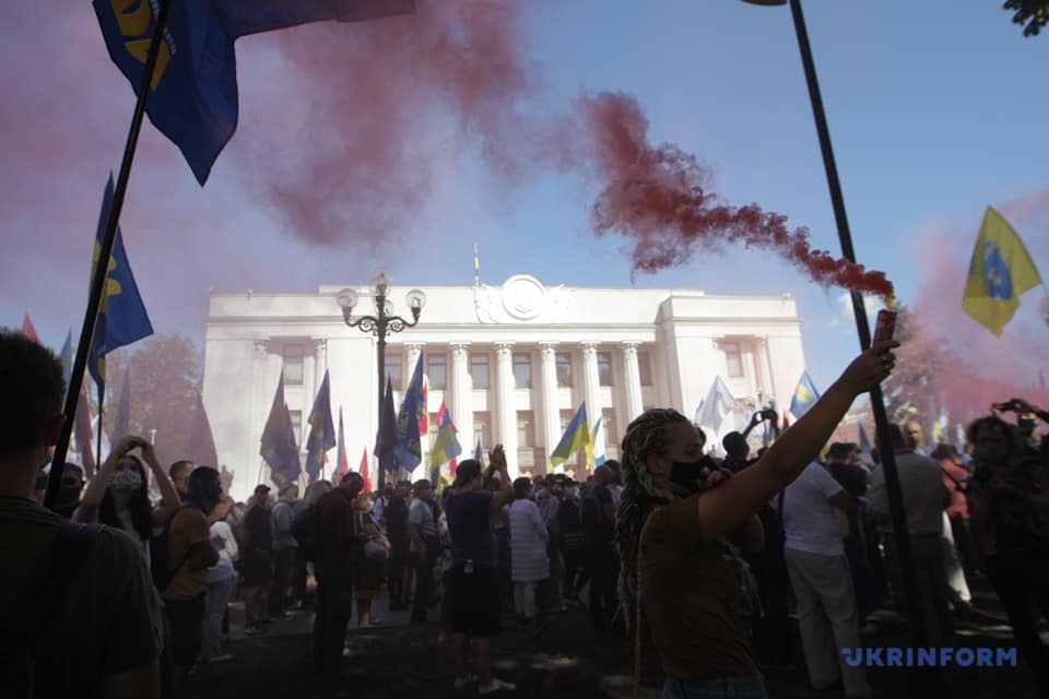 Під час акції під стінами парламенту щодо законопроєкту про навчання державною мовою в закладах освіти люди запалили червоні фаєри.