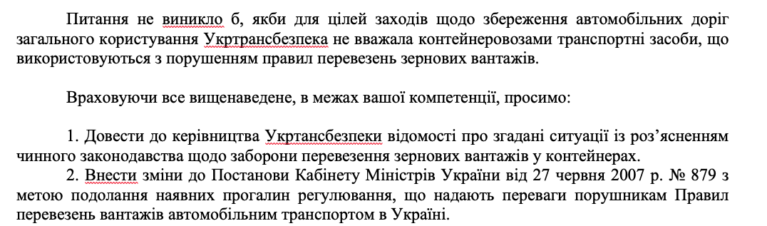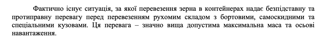 Немедленно разработать совместный приказ и прекратить пропускать на наши дороги переделанные контейнеровозы для перевозки зерна автотранспортом. Убрав такие машины с дорог, мы уменьшим на 35-40% количество перегруженных автопоездов. Тем более, что такой подход - полностью законен, т.к. перевозить зерно в контейнерах по дорогам вообще запрещено по п. 19.1.1 Правил перевезень вантажів автомобільним транспортом в Україні, наказ Міністерства транспорту України від 14.10.1997 р. №363. Просто два министерства (руководимые, по сути, одним непростым человеком!) не могут решить, кто же должен выполнять этот приказ. Аваковцы из МВД (Нацполиции) кивают, что не могут наказывать “дальнобоев” по этому приказу от МИУ, а “аваковцы” из МИУ утверждают, что у них также нет оснований применять этот приказ - они не правоохранительный орган.