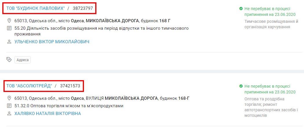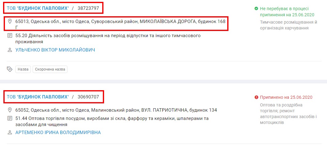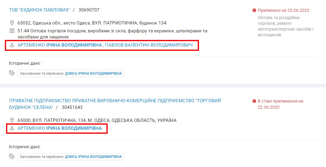 По декларации родственных связей, тесть Артеменко Валентин Павлов индивидуальный адвокат с 2013 года, но на портале «Судебная власть» мы не нашли дел, где Павлов выступал бы защитником. Свою деятельность осуществляет по адресу Николаевская дорога, 168. Там, на побережье, расположен уже упоминавшийся гостиничный комплекс «Дом Павловых», состоящий из больших жилых и нежилых помещений. Земельными участками под ними владеет теща Анна Павловна. Оба основали уже упомянутое ООО «Дом Павловых», где работала их дочь Ирина Артеменко, и которое сейчас приостановлено. В ЕГР мы также нашли действующее общество с пропиской на территории отеля, но с минусовой чистой прибылью.