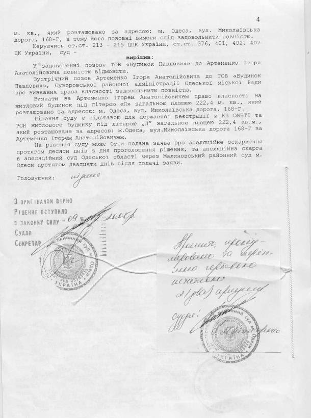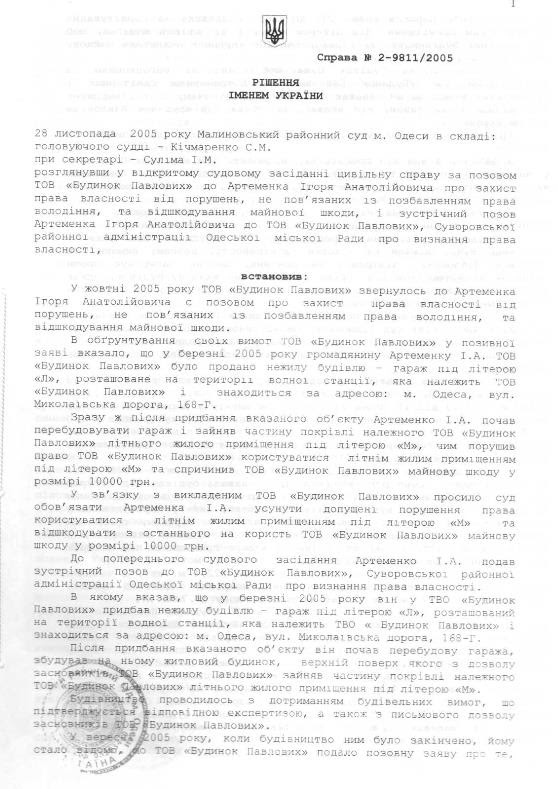 И это очень интересный объект. Право собственности на него возникло на основании решения Малиновского суда г. Одессы от 28.11.2005 года по делу № 2-9811/2005. Важно отметить, что недвижимость расположена в Суворовском районе и в соответствии со ст. 114 действующего на тот момент ГПК иск должен был рассматриваться Суворовским судом г.Одессы.
