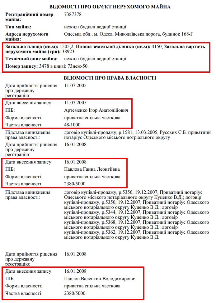 Из него следует, что И. Артеменко на основании договора купли-продажи от 13.03.2005 года приобрел у ООО «Дом Павловых» 48/100 частей нежилых зданий водной станции. Подписантом этого договора и директором ООО «Дом Павловых» была жена члена ВРП - Артеменко Ирина Владимировна.
