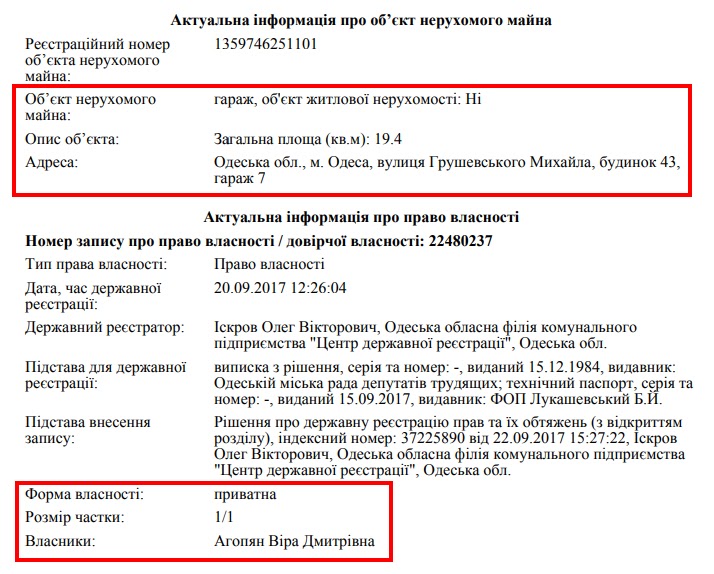 Это - весь перечень задекларированного семейного имущества. Нам также удалось узнать имена родителей члена ВСП. А еще - проверить, какую же недвижимость они смогли нажить. Мать Вера Агопян не была зарегистрирована предпринимательницей, и долей в бизнесе мы также у нее не нашли. Ранее получала доход от частного предприятия «Пром-Торг», когда руководителем и главным бухгалтером была Анна Павлова. Однако в собственности Веры Дмитриевны мы нашли квартиру в Одессе площадью 66,8 кв. м и три гаража. По нашей информации, отдельные договоры на покупку этих гаражей подписывал от имени матери именно член ВСП Игорь Артеменко.